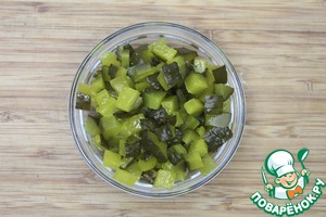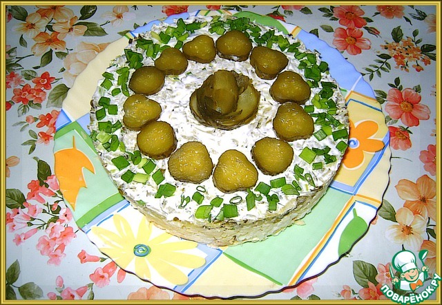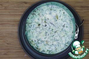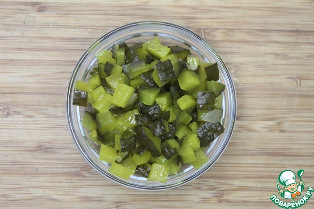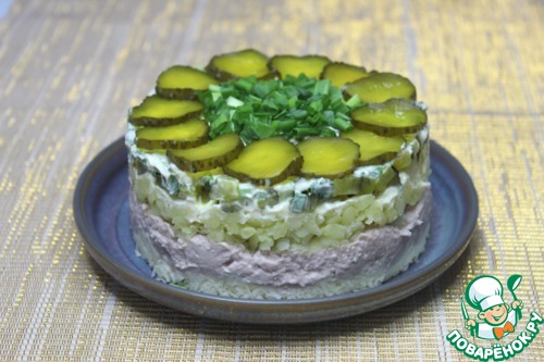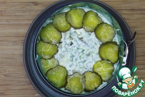 Верх украшаем тонкими слайсами маринованного огурца - середину оставляем пустой.