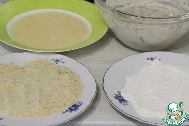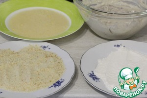 Приготовить три тарелки для панировки: в одну насыпать муку, во вторую сухари, в третье взбить яйца.