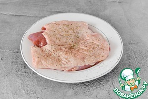 На коже утиной грудки сделайте косые надрезы, прорезая только кожу. Посолите и поперчите грудки со всех сторон.