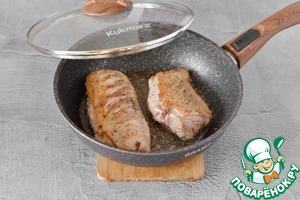 Нагрейте хорошо сковороду, обжарьте грудки с двух сторон до румяной корочки по 5 минут с каждой стороны. Первоначально кладите грудки кожей вниз. Обжаренные утиные грудки снимите со сковороды. -