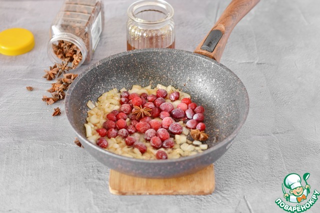 А на вытопившемся жире поджарьте нарезанный мелко лук до лёгкого золотистого цвета. После чего добавьте клюкву.