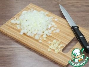 • 3. Приготовим соус. Лук и чеснок очищаем и мелко нарезаем.