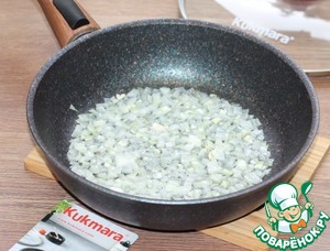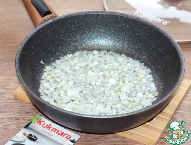 • 4. На разогретом растительном (2 ст. л.) и сливочном масле (2 ст. л.) обжариваем лук до "прозрачности", 3 минуты.