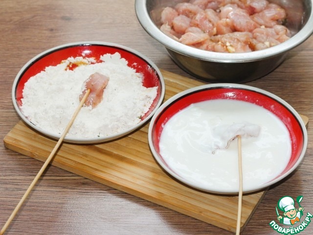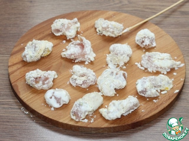 • 10. Приступаем к панировке куриного филе - сначала кусочки обваливаем в муке, затем в сметане, и опять в муку.