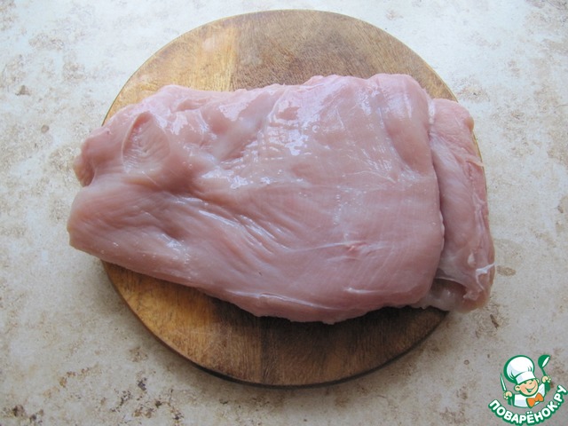 Мякоть индейки вымыть, промокнуть бумажным полотенцем, разрезать пополам в пласт.