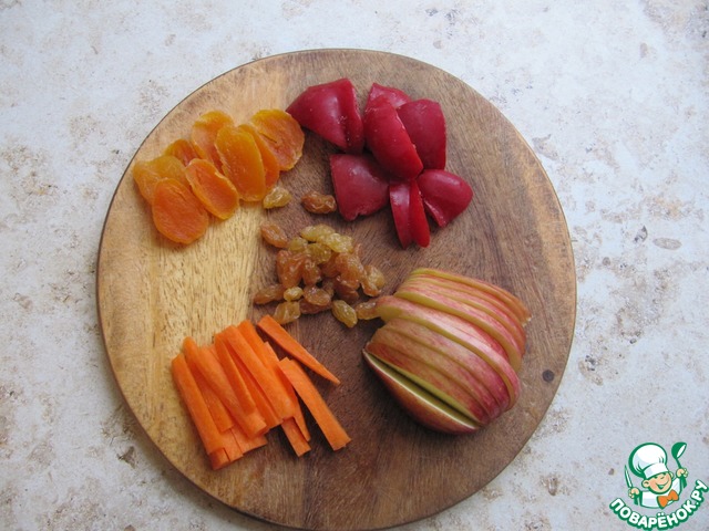 Подготовить яблоко, морковь, перец, курагу и изюм (состав можно менять по-своему вкусу), помыть, нарезать морковь соломкой, яблоко тонкими дольками, перец произвольно, курагу пополам.