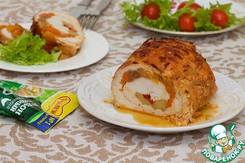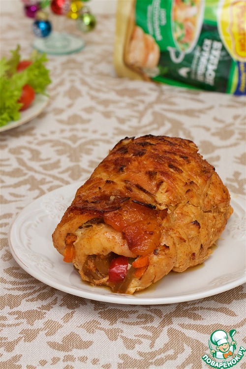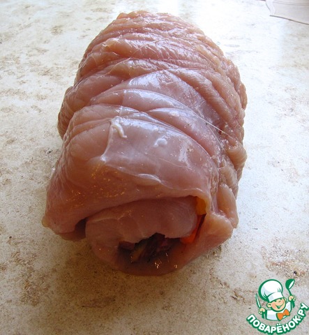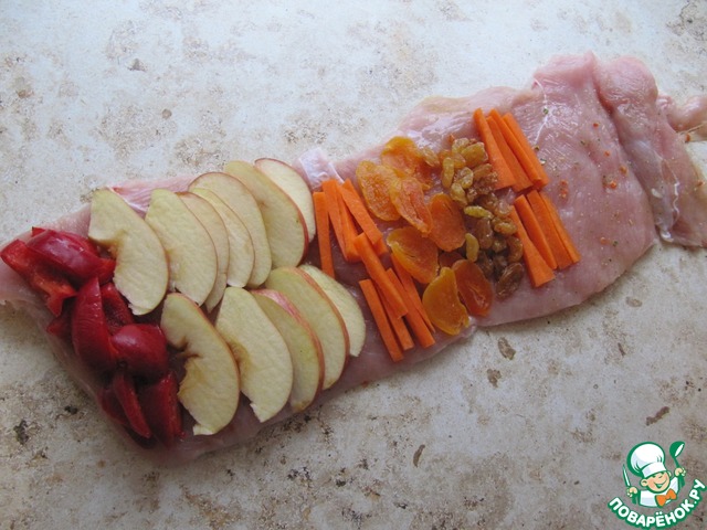 Выложить подготовленные овощи и фрукты на мякоть индейки, отступив от одного края, свернуть плотным рулетом.