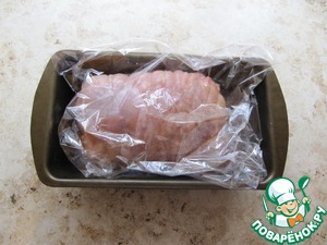 Переложить рулет в пакет для запекания, край подвернуть и закрепить, проткнуть пакет сверху в нескольких местах для выхода пара зубочисткой. Запекать в предварительно разогретой до 180 с духовке около часа.