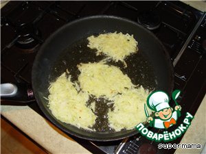 • В сковороду льем растительное масло, так чтобы не было пробелов, и выкладываем ранее приготовленный картофель.