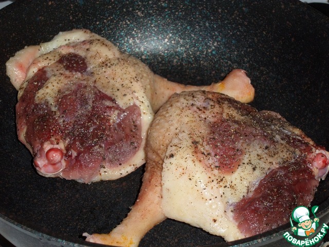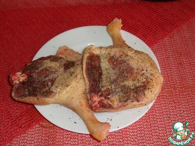 Утиные ножки натираем солью и перцем. Оставляем на 1 час.