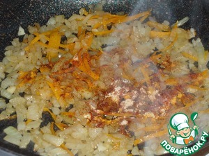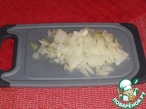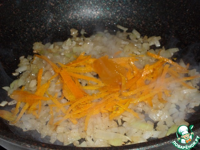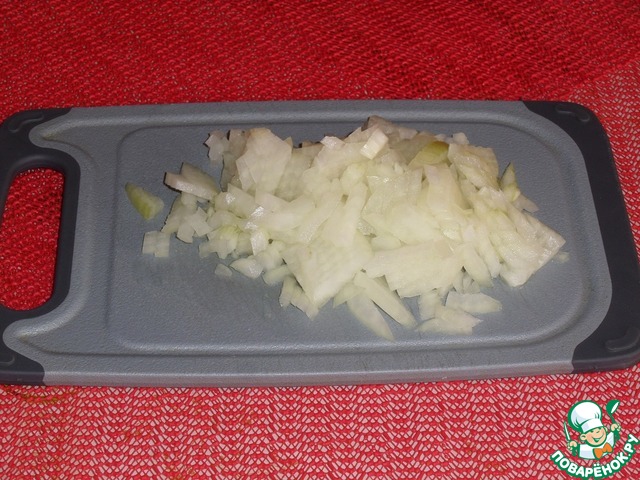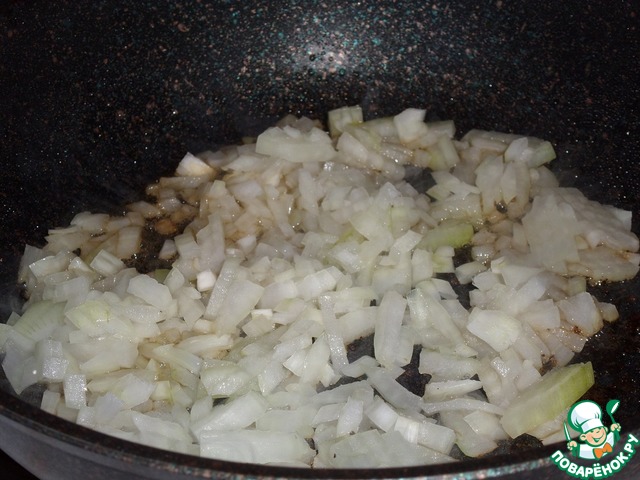 В сковороду добавляем 1 ч. л. растительного масла и выкладываем нарезанный лук. Обжариваем лук в течении 3 минут.