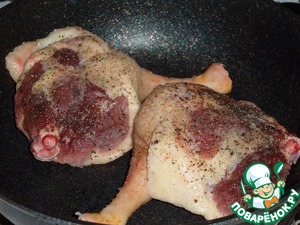 Сковороду ставим на огонь. Хорошо разогреваем. Выкладываем в сковороду утиные ножки. Обжариваем 3-4 минуты с одной стороны.