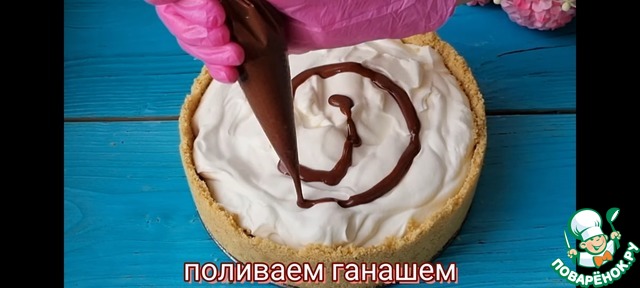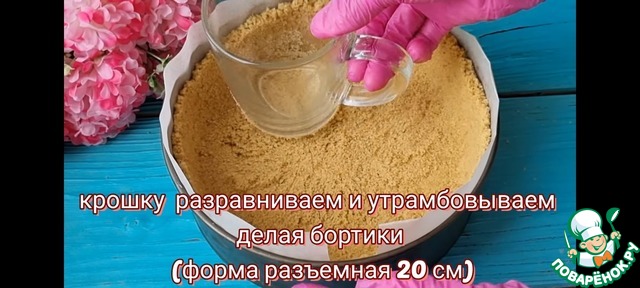 Печенье измельчаем в крошку и перемешиваем с растопленным сливочным маслом. Затем перекладываем в форму диаметром 20 см и распределяем равномерно делая бортики. И отправляем в холодильник на 40 минут.