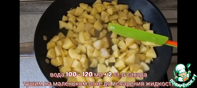 Очищенные яблоки нарезаем на небольшие кусочки и обжариваем на сухой сковороде на среднем огне 2 минутки, далее добавляем сахар и воду. Далее тушим на маленьком огне до испарения жидкости переодически помешивая. После полностью остужаем.
