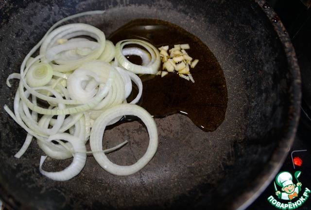 Чистим чеснок (3 зуб), мелко режем. Сковороду нагреваем, наливаем масло, кладём оставшийся лук и чеснок. Обжариваем, помешивая, на среднем огне 3-4 минуты.