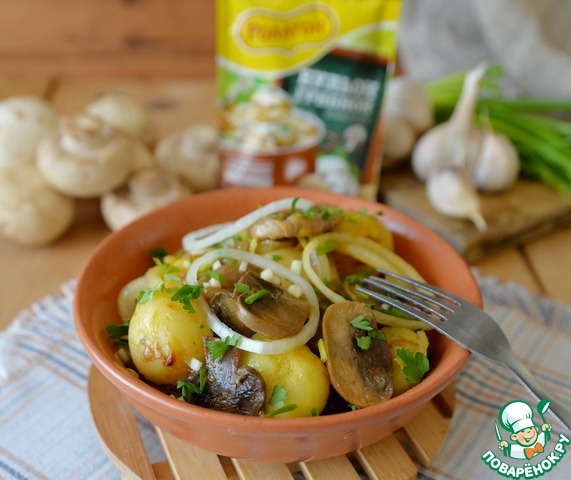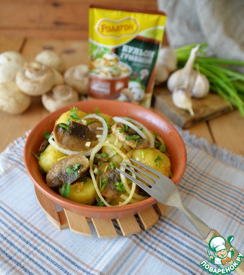 Идею салата увидела в интернете и сразу решила приготовить, тем более, что я падкая на оригинальные названия. А тут - всё предельно просто и не может быть невкусно. Картофель, грибы, лук, чеснок, зелень - беспроигрышное сочетание. Рецепт универсален. Можно использовать, как гарнир к любому мясу, особенно к шашлыку. А можно, как закуску. Также в Пост такое блюдо разнообразит ваше меню. Плюсом салата является то, что он не портится быстро, как майонезные салаты, а становится ещё вкуснее и насыщеннее.