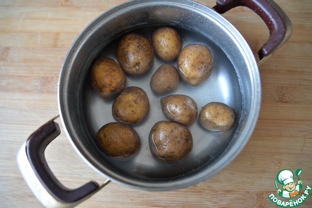 Я готовила половину указанного количества. Берём картофель, идеально, конечно, мелкий, молодой картофель. Но берём то, что имеем. Картофель тщательно моем, заливаем водой, доводим до кипения и варим на медленном огне до готовности 15-20 минут. Зависит, конечно, от размера и сорта картофеля. Далее воду сливаем, даём картофелю остыть.