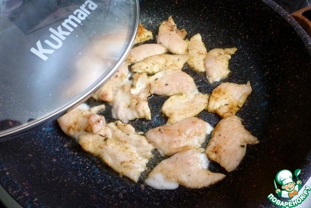 Куриное филе нарезать тонкими ломтиками, посолить, поперчить, посыпать карри. Оставить пропитаться 10-15 минут.