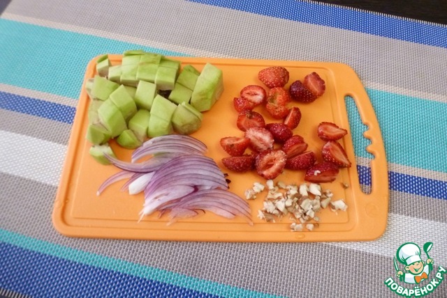 • Количество ингредиентов примерное, т. к. размеры овощей и клубники разные. Кол-во клубники и лука должно быть адекватно мясу, ну и по вашему вкусу, конечно.