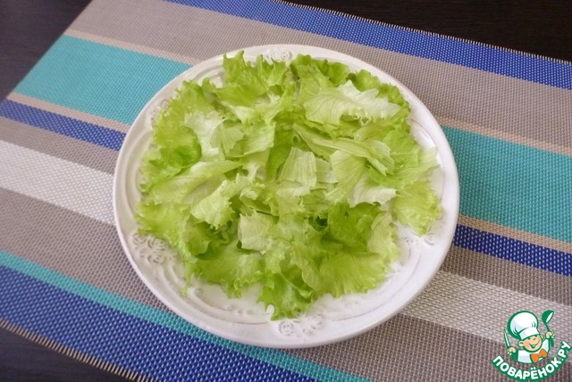 • Листья салата порвать на крупные кусочки и разложить на тарелке.