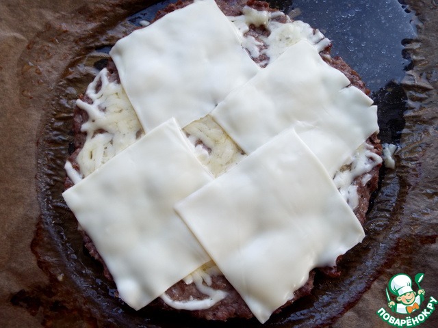 Сформировать котлету, большим диаметром, чем булка. Удобно делать это в разъёмом кольце. Готовить котлету при 180 градусах до прозрачного сока внутри. Примерно 15 минут.