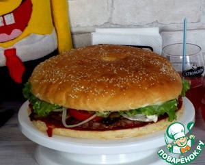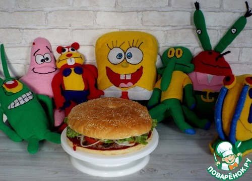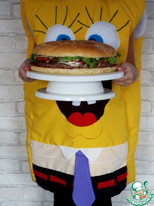 Ещё один из популярных мультсериалов моего детства - это "Губка Боб квадратные штаны". Признаюсь честно, я не фанатела от этого мультфильма, но вот мой супруг смотрел, а потом смотрел и с моим младшим братом, а позже и с сыновьями. В данное время увлечён этим своеобразным героем младший ребёнок, ему 8 лет. Искоса, мой взгляд падает на происходящее на экране)). И я, как увлеченный кулинарией человек, не могла не заметить, чем занимается Спанч Боб. А именно, множество серий посвящены приготовлению и рекламе его фирменных "Крабсбургеров", секретная формула приготовления, которых не раскрывалась никогда. Где-то фигурирует примерный состав этого бутерброда. По нему я и решила приготовить этот мега большой, сочный и обалденно вкусный бургер. А зачем такой большой?? Да, чтобы хватило на большую дружную компанию!!!)))