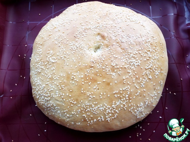На противень с бумагой или ковриком выложить тесто и распределить в круглую однородную лепешку, примерный диаметр 24 см. Смазать булку молоком, посыпать кунжутом, накрыть полотенцем и оставить на 10 минут.