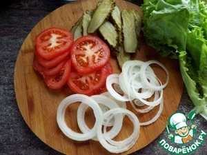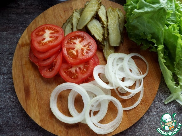 1)Булку стоит постараться разрезать ровно пополам, но, если получилось так, что верх получился толще, срезать еще небольшой слой, чтобы слои с овощами и котлетой были равномерными. Опять же, если сделать котлету толще, то всё будет отлично.