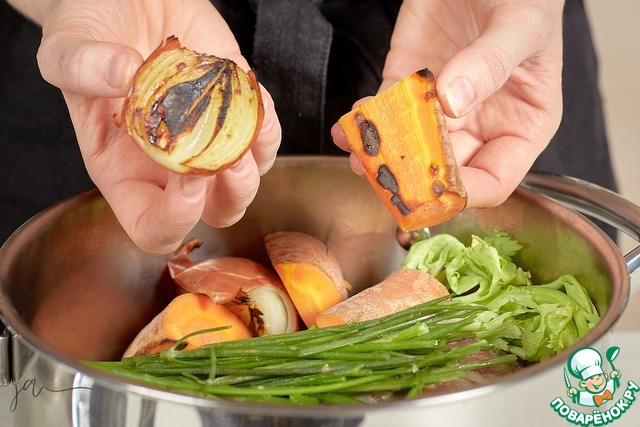 Для бульона так же сгодится и подсохшая в холодильнике морковка. Ее не нужно чистить, просто хорошо помыть и пожарить на сухой сковороде без масла до черноты, как и луковицу. Так же для красивого цвета тоже нечищенная, только срежьте корешки.