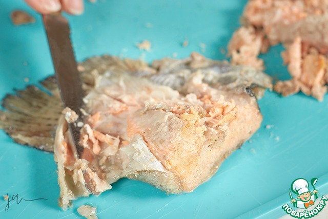 Аккуратно снять с хребтов рыбное мясо. Достать мясо из рыбьих голов. Кстати, мясо рыбных голов даже имеет свое название - "головизна" и является деликатесом.