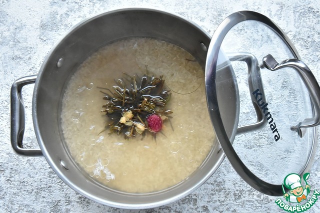 В кастрюлю к рису добавляю соль, растительное масло и чайный цветок. Накрываю посуду крышкой и на среднем огне варю рис в течение 12 минут. Если у вас половина порции (1 стакан риса и 2 стакана воды), для приготовления достаточно 7 минут.
