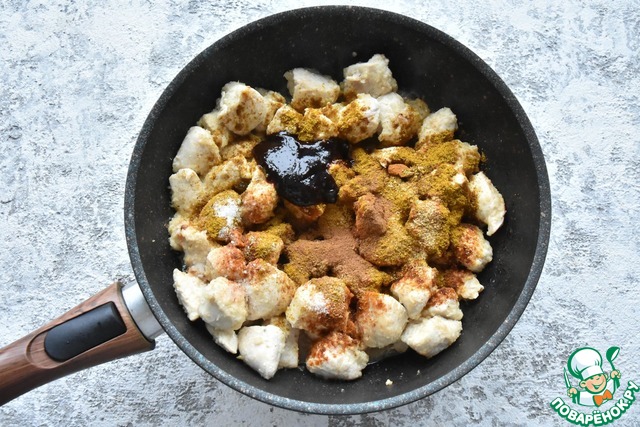 К обжаренному филе добавляю смесь специй, соль и пасту тамаринда. Перемешиваю, чтобы специи обволокли и проникли в каждый кусочек.