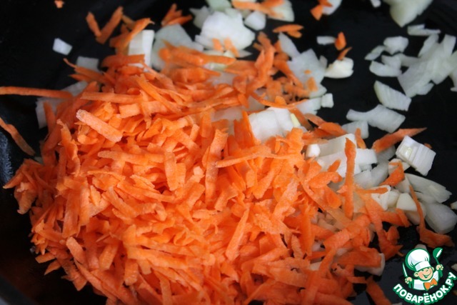 На разогретую сковороду налить немного масла и обжарить сначала мелко нарезанные лук с чесноком. Затем добавить к ним натёртую на крупной тёрке морковь.
