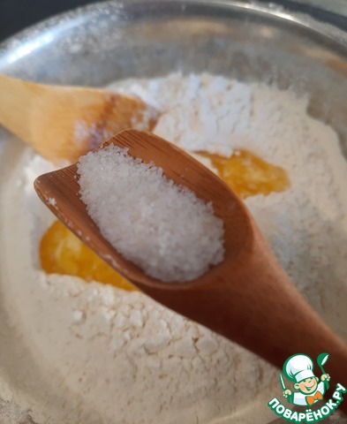 Сливочное масло и сметана должны быть комнатной температуры. Масло необходимо размягчить, а можно и растопить. Добавляем в муку сметану, масло и соль.