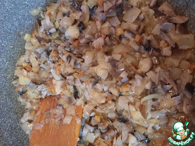 Мнем картошку толкушкой, добавляем сало с грибами и досаливаем по вкусу. Начинка готова. Даем ей остыть.