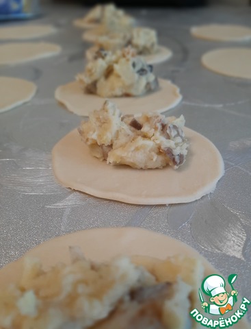 Достаем наше тесто и даем ему немного полежать на столе. Делим его на части и раскатываем ровными тонкими пластами, нарезаем кружочки и выкладываем на каждый начинку.