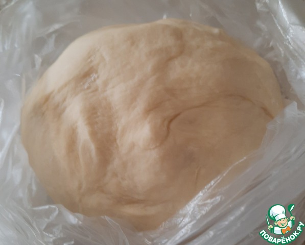 Готовое тесто убираем в целлофановый пакет или пищевую пленку и отправляем в холодильник. Даем ему"отдохнуть" пока будем делать начинку.