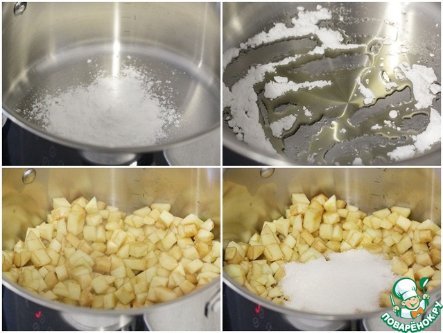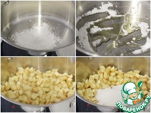 Растопить её до светлой карамели, всыпать яблоки и добавить сахар. Хорошо перемешать. -