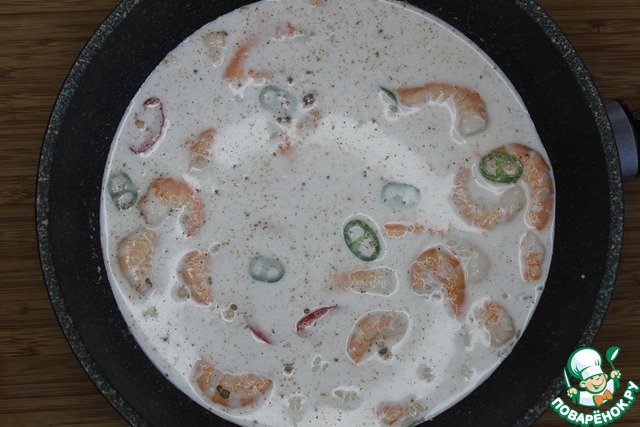 В сковороду всыпаем креветки, рис, чили, специи, соль.