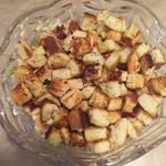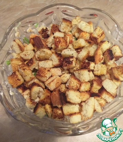 У меня со своими домашними сухариками. Твёрдый сыр нарезала кубиком. Из зелени - зелёный лук. Получился интересный, очень даже не плохой салатик! Периодически буду готовить. Жазгуль! Большое спасибо за рецепт! С Рождеством!