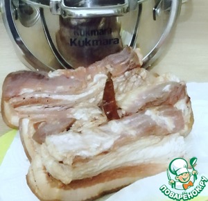 Я взяла сало с прослойками мяса, разрезала на неширокие бруски. Сало следует хорошо очистить от всего лишнего, это можно сделать тупой стороной ножа. Затем промыть в холодной проточной воде. Обсушить. -
