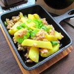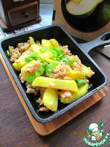 Перемешайте картофель с фаршем и выложите в сковороду, отсоедините ручку -