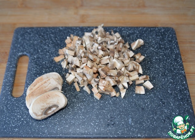 Шампиньоны моем, обсушиваем, мелко режем. Половину гриба порезала пластинами для декора.