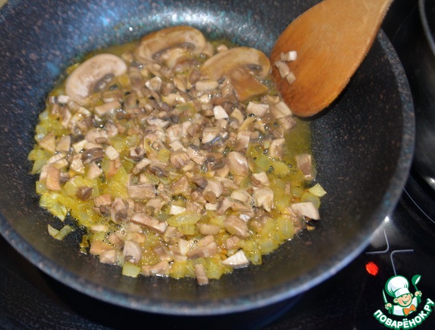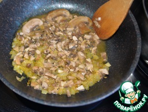 На сковороду наливаем масло, нагреваем, обжариваем лук и чеснок 2 минуты на среднем огне, затем кладём грибы и обжариваем до выпаривания жидкости около 5 минут на среднем огне.
