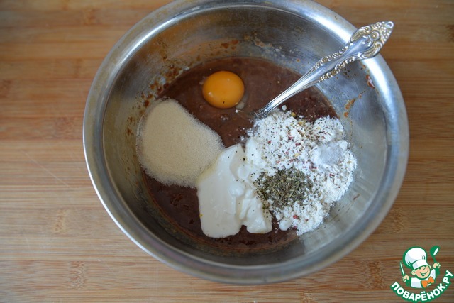 К печени добавляем яйцо, сметану, муку, манную крупу, разрыхлитель, зелень, смесь перцев. Перемешиваем, чтобы не было комочков. Манная крупа делает оладьи нежнее, сочнее и пышнее.