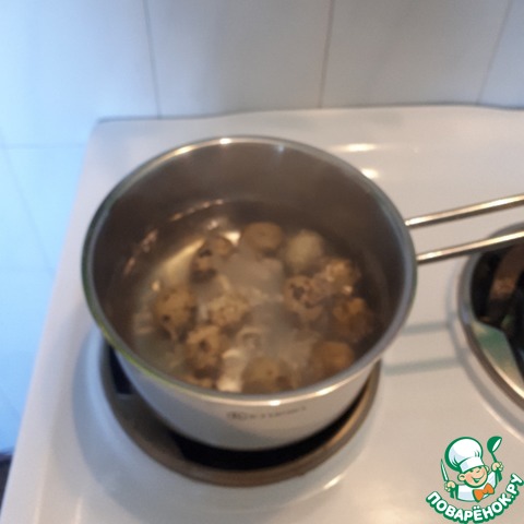 Отварить перепелинные яйца в течение 4-5 минут, залить холодной водой, очистить скорлупу.