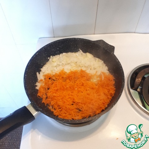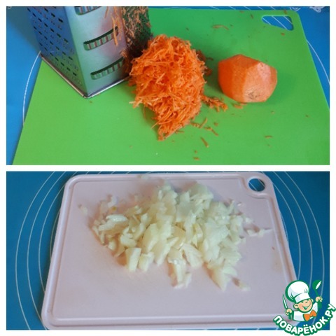 Репчатый лук нарезать мелко кубиком, морковь натереть на терке.