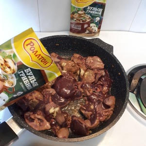 Куриную печень обжарить на сковороде до готовности, добавить сухой грибной бульон "Роллтон", поперчить по вкусу.