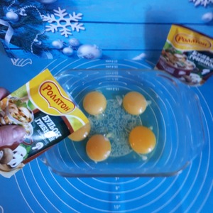 Приготовим тесто для рулета. Разбить в миску яйца, довавить к ним сухой грибной бульон"Роллтон", перемешать.