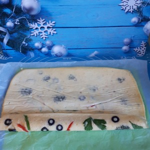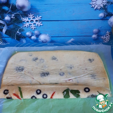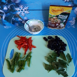 Подготовить украшения. Маслины нарезать колечками, красный и зеленый болгарский перец нарезать полосочками, подготовить листики петрушки. К нарезанному укропу добавить 3 ч. л. теста, перемешать.